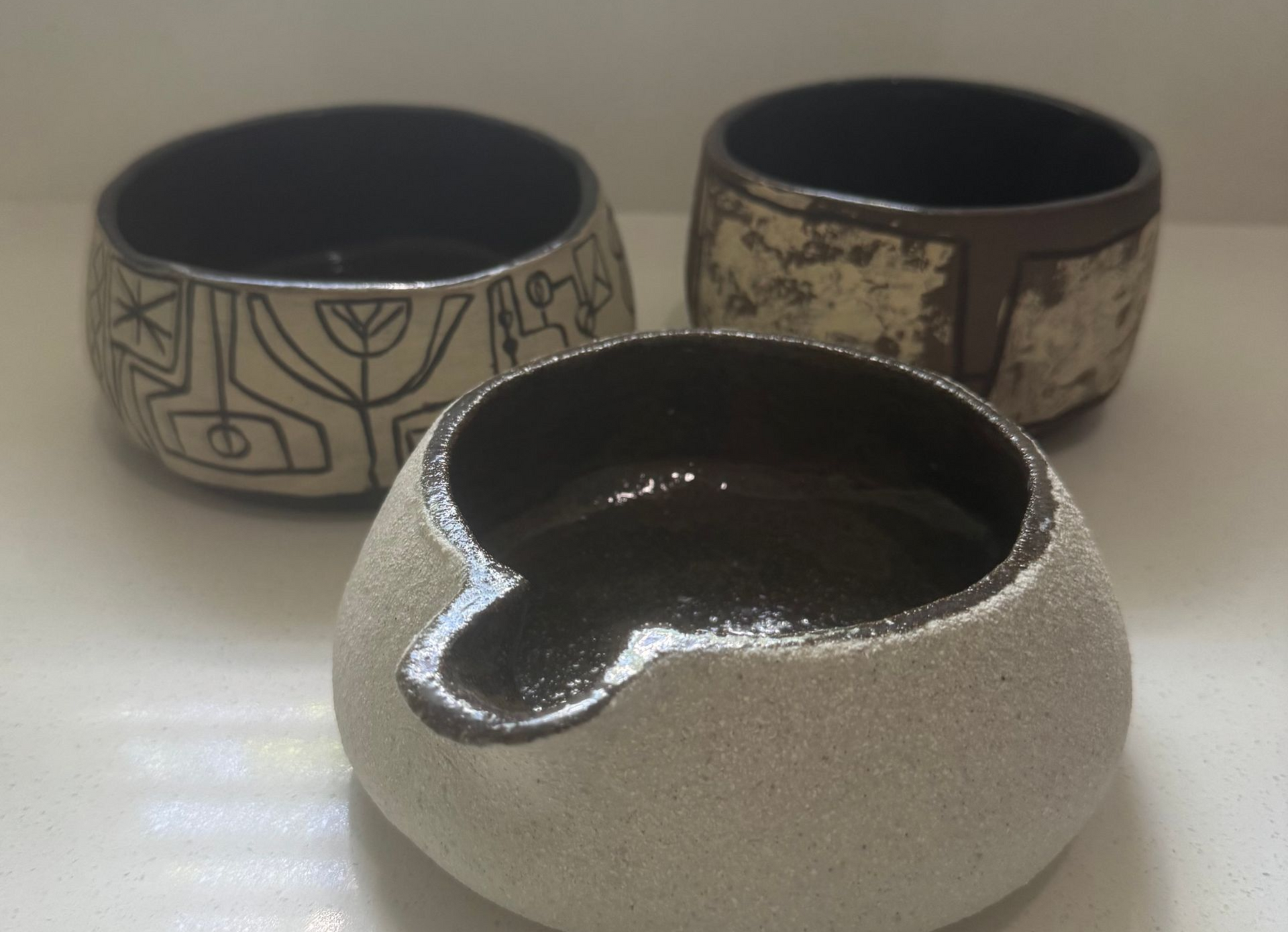 Hand built pinch pots. Glazed interiors and variety of surface decorations. Some have spouts.