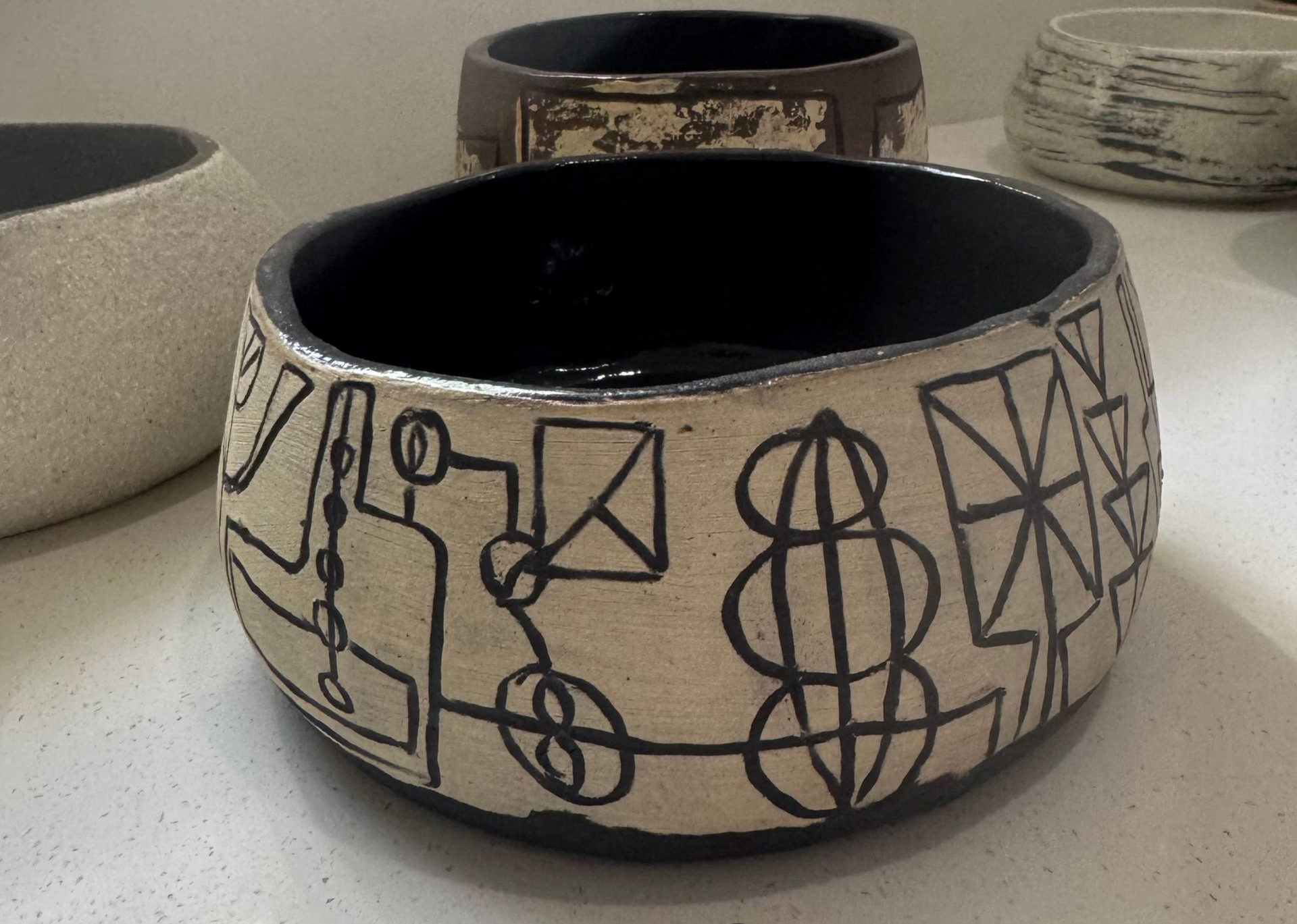 Hand built pinch pots. Glazed interiors and variety of surface decorations. Some have spouts.